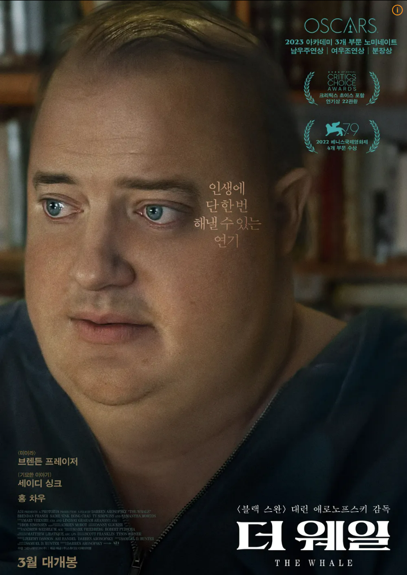 영화 제목이 왜 '더웨일'이냐 싶겠지만, 영어권에서는 뚱뚱한 사람을 고래 (Whale)이라고 표현하는 등 속어로 사용되고, 영화 내에서 모비딕 소설의 구절이 나오다 보니 그런 것 같습니다.